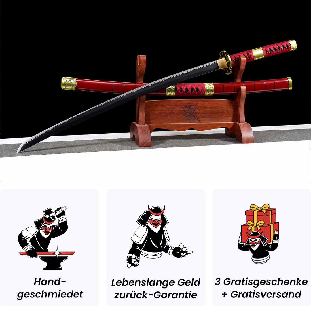 Entdecken Sie das Katana Sandai Kitetsu von Zoro Roronoa, handgeschmiedet von unseren Kunsthandwerkern. Ein authentisches Samurai-Schwert aus 1060er Kohlenstoffstahl, inspiriert von der Welt der japanischen Katanas und One Piece. Handgefertigt für Exzellenz. Perfekt für Fans von One Piece! Trete unserer Samurai-Armee bei!